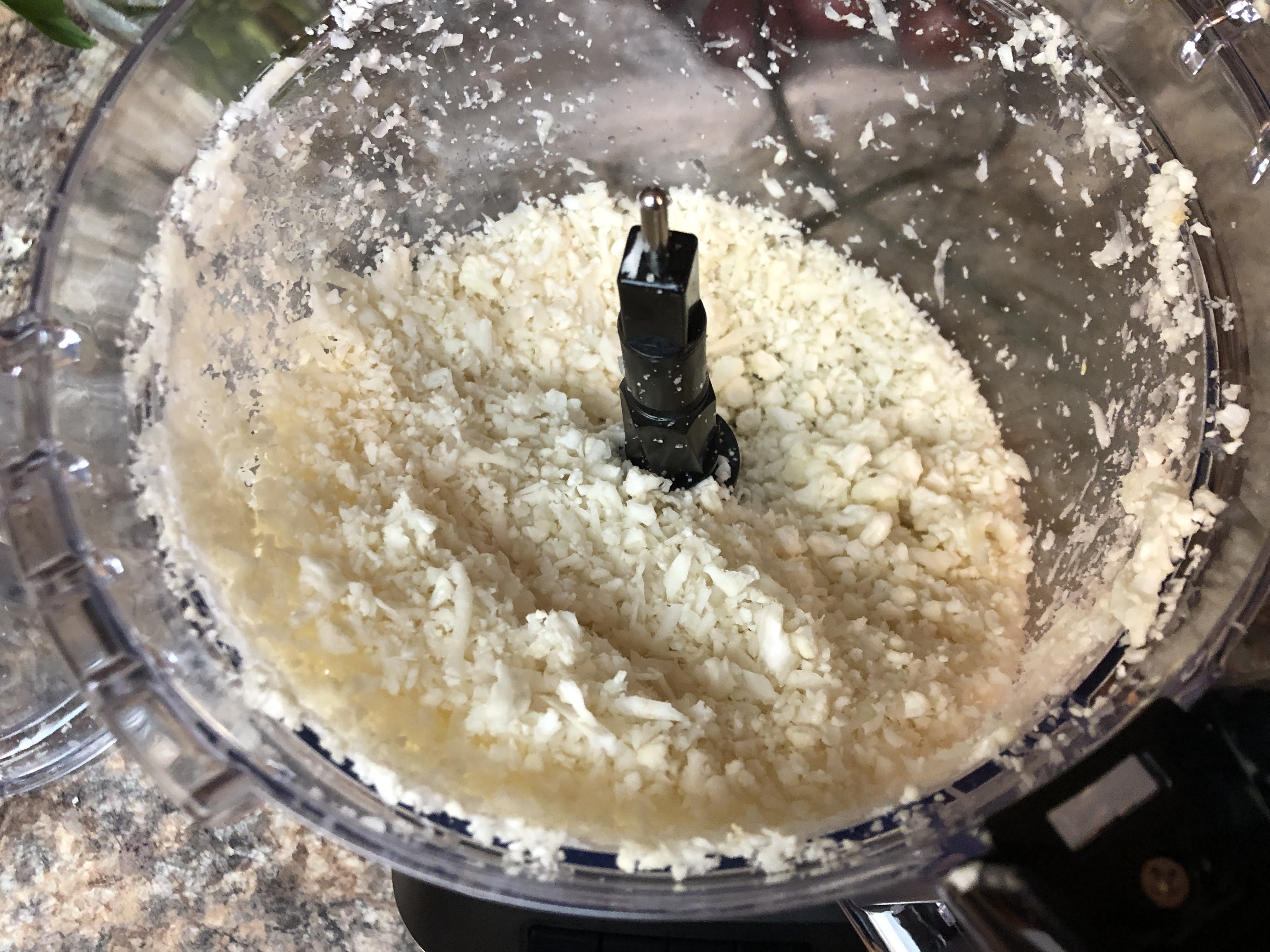 - The first step is to make cauliflower rice. This can be bought prepackaged, but is very simple to make with a head of cauliflower. Add cauliflower to a food processor/blender and chop; or cut by hand. The goal is to have rice sized pieces of cauliflower.