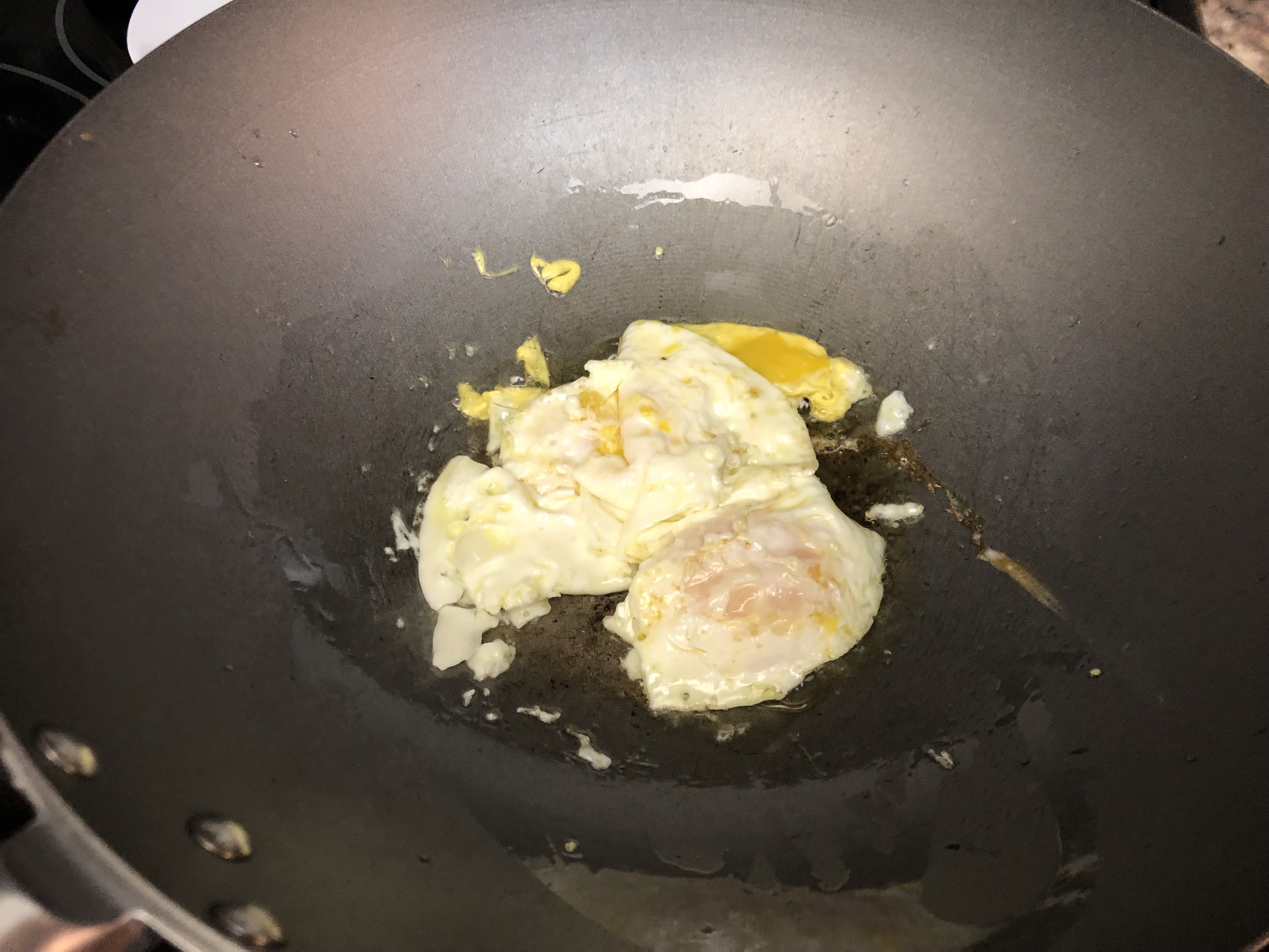 - Heat oil in a wok over medium heat. Add both eggs and cook to over-hard or your preference. Add to a large bowl when done.