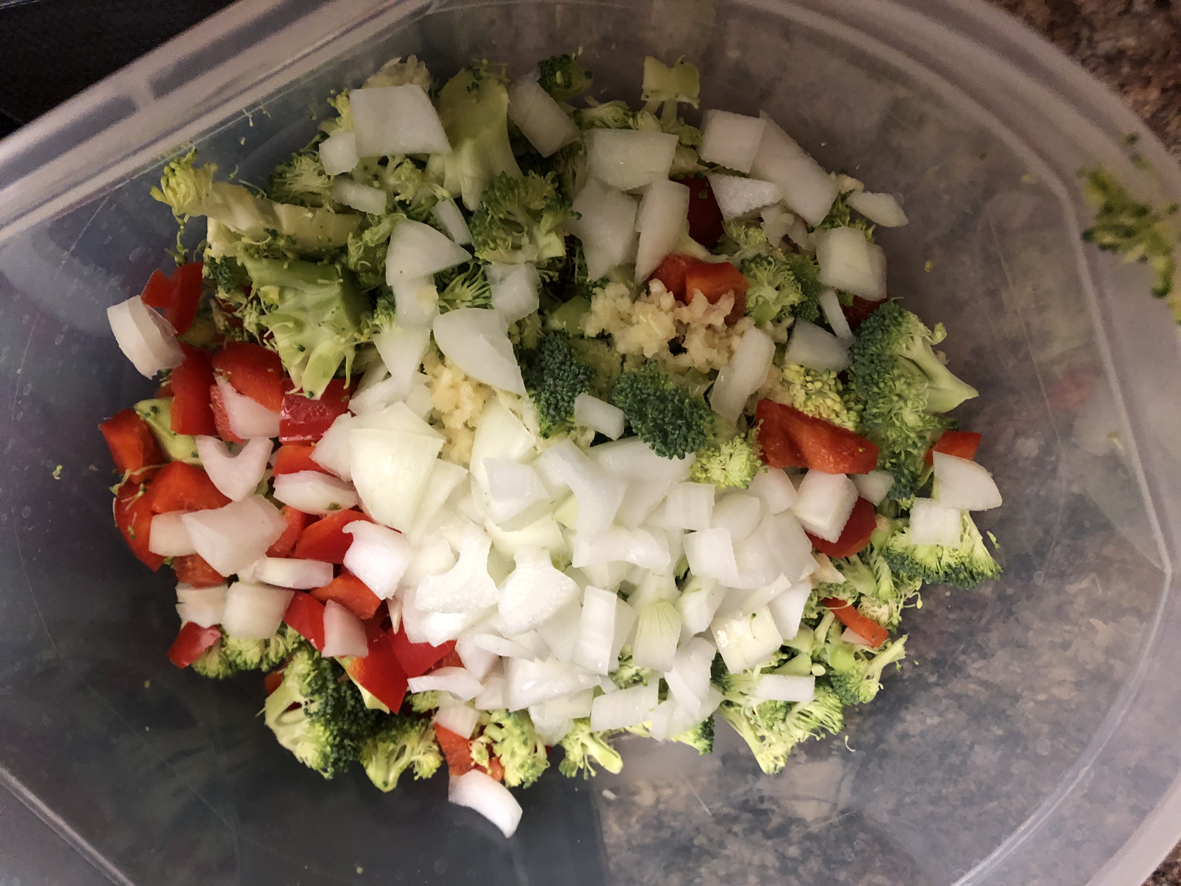 - While the cauliflower rice is cooking, cut the head of broccoli into smaller florets. Cut the red pepper and onion into small pieces and mince the garlic.