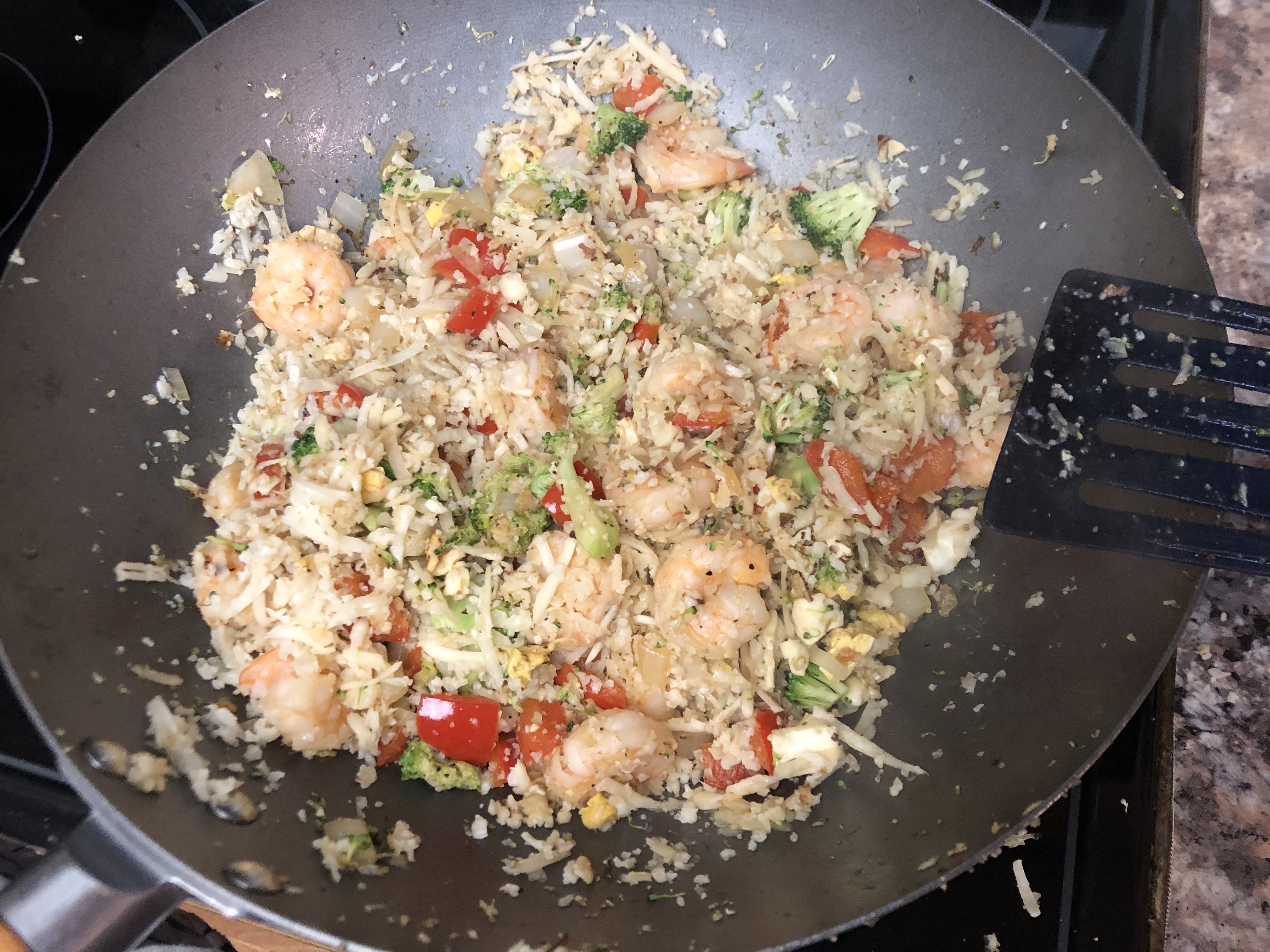 - Next, add cauliflower rice to the wok. Add any seasonings of choice (black pepper, etc). Let cook without stirring for 4 minutes. It should start to brown on the bottom. Transfer to the bowl with the eggs and mix.