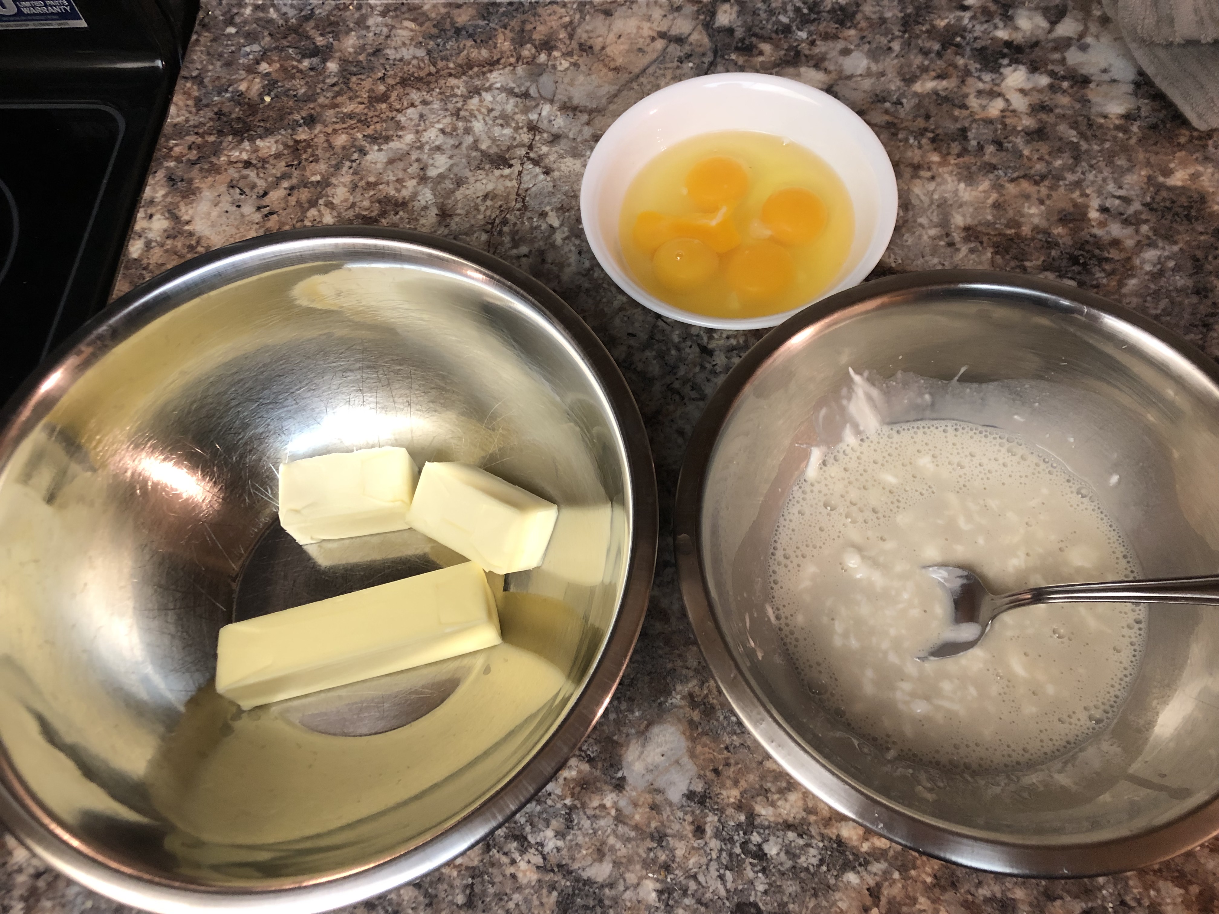 - First, we need to let half the items sit to room temperature for a half hour. In a large bowl, let the butter sit. In a small bowl, combine the milk and plain Greek yogurt. Mix and let sit. Finally, in another small bowl, add the 3 eggs. Carefully separate the egg yolks and add to the same bowl, and, of course, let sit.