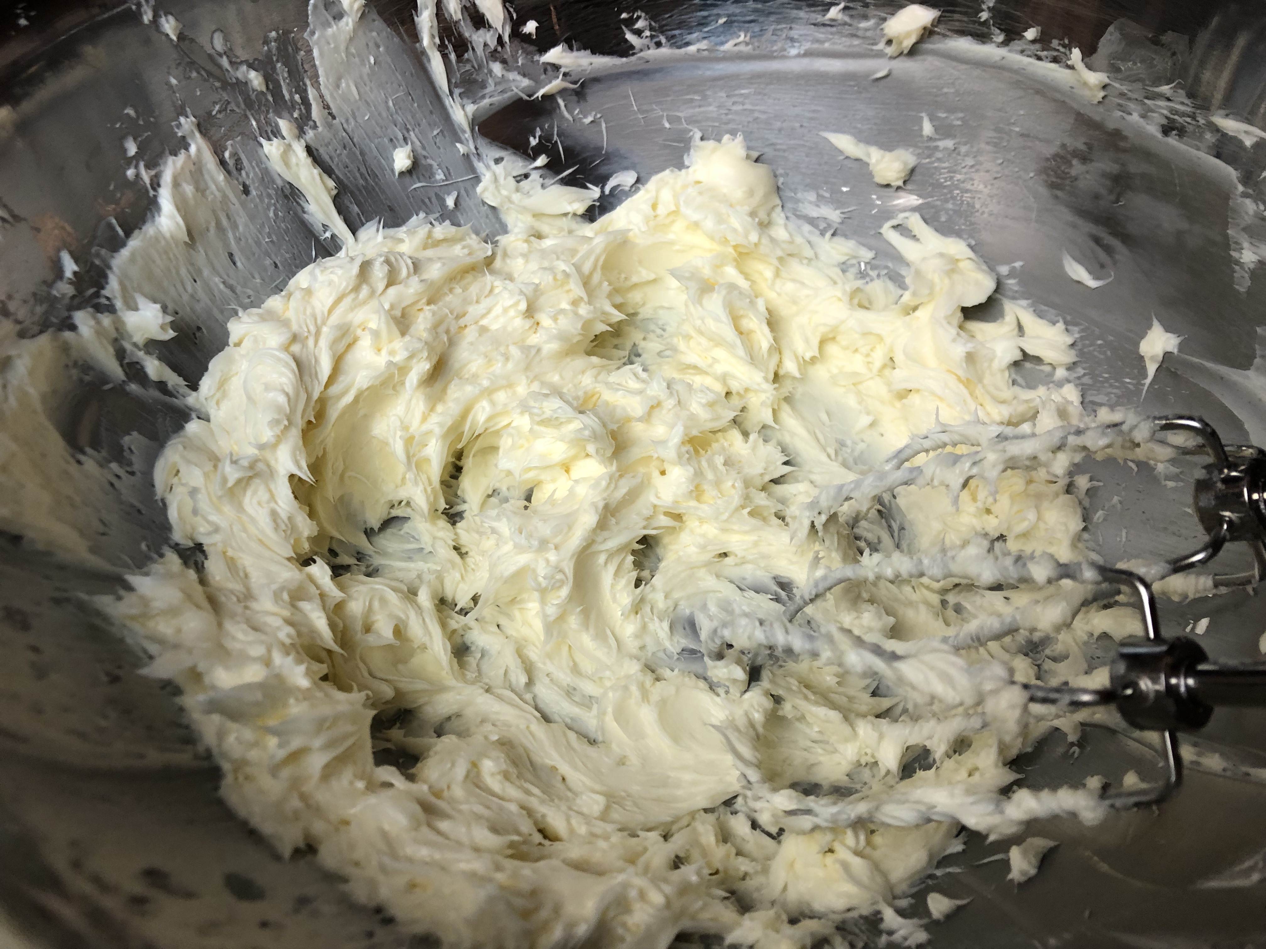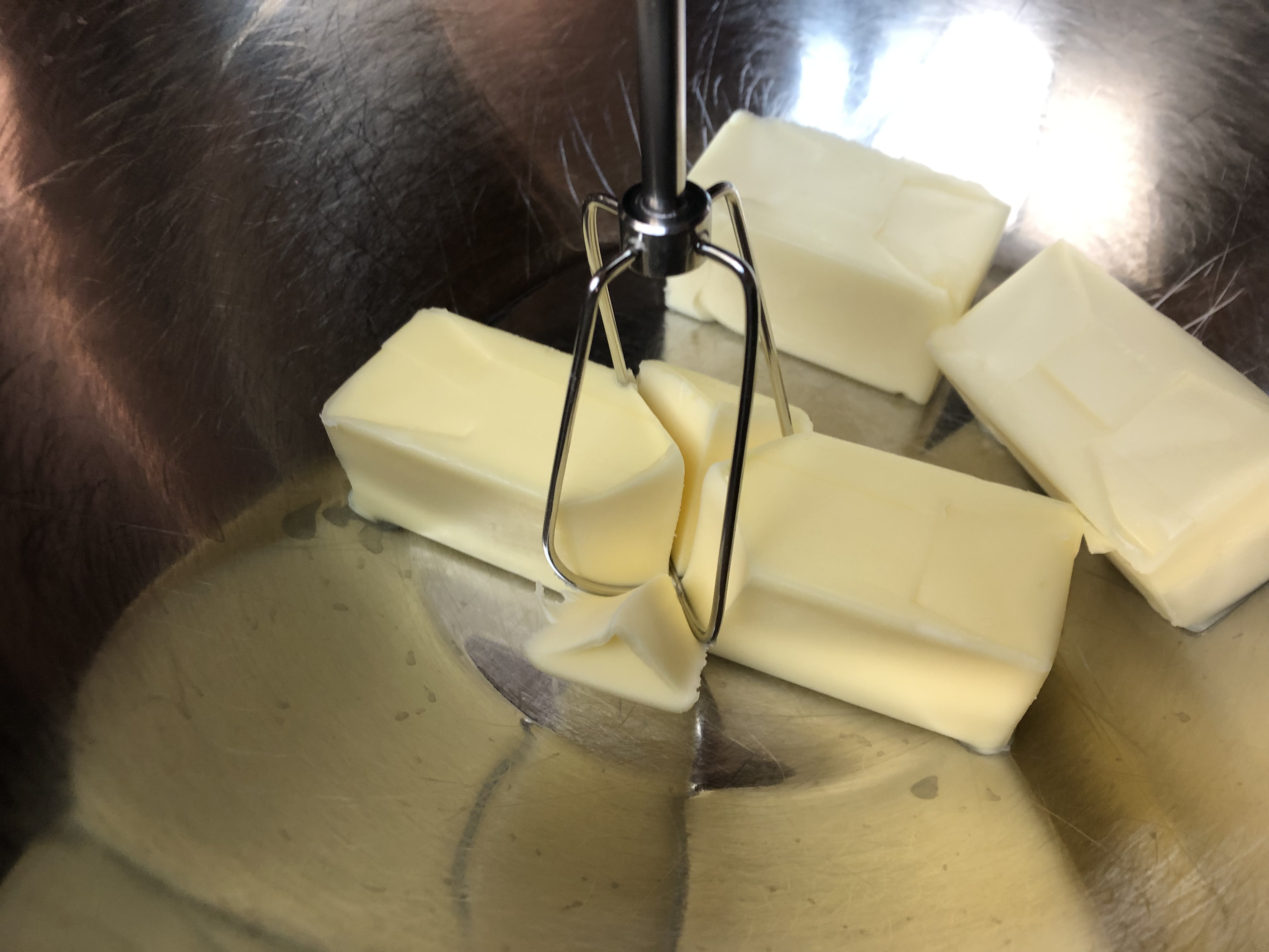 - Preheat oven to 350 °F. Once softened, mix the butter on medium high speeds for 1-2 minutes, scraping the sides of the bowl as necessary. It is softened once you can push the beater right through without much effort, a shown in the first photo. The second photo shows what the butter will look like after the 1-2 minutes.