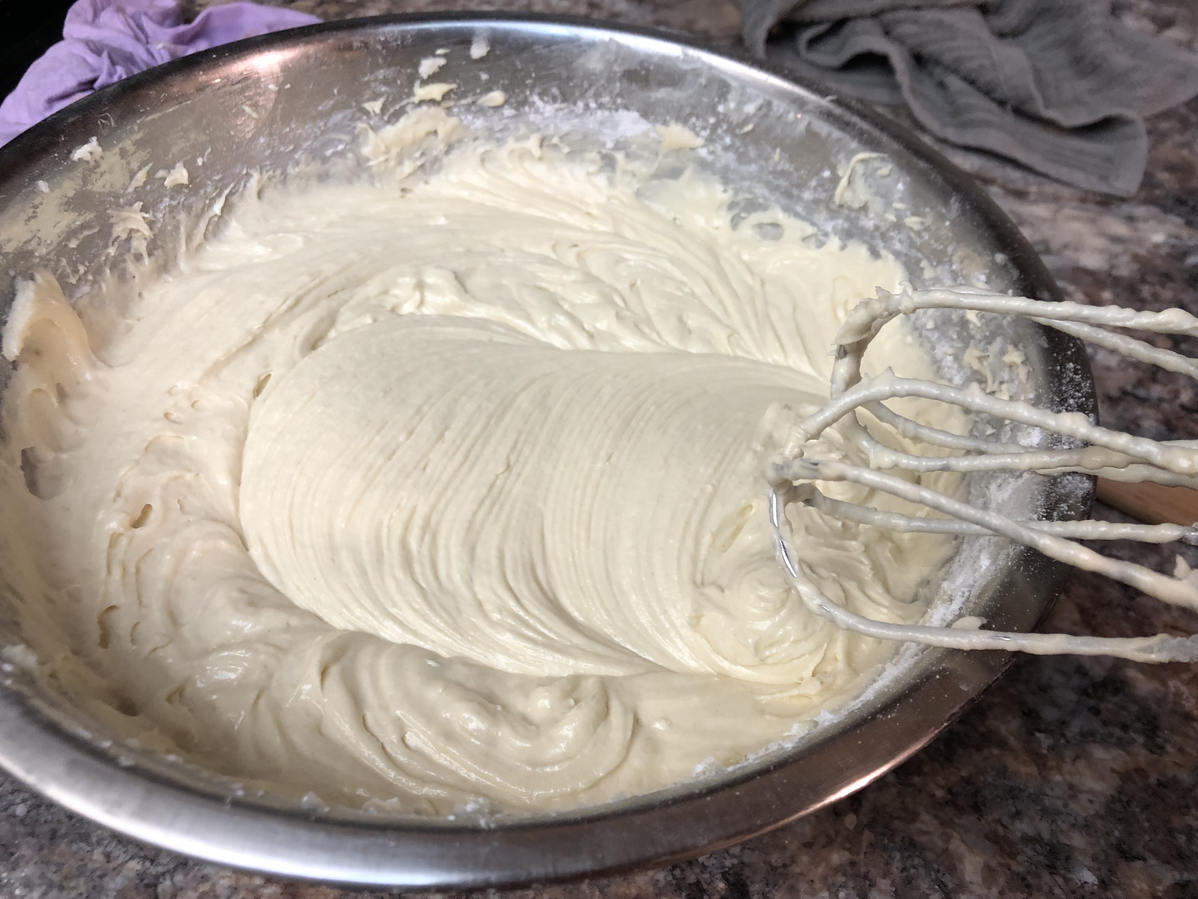 - In a separate bowl, whisk together the flour, cornstarch, baking powder, baking soda, and salt. Now, over 5 pours and mixes, we will begin adding everything to the butter/sugar.eggs/vanilla bowl.
