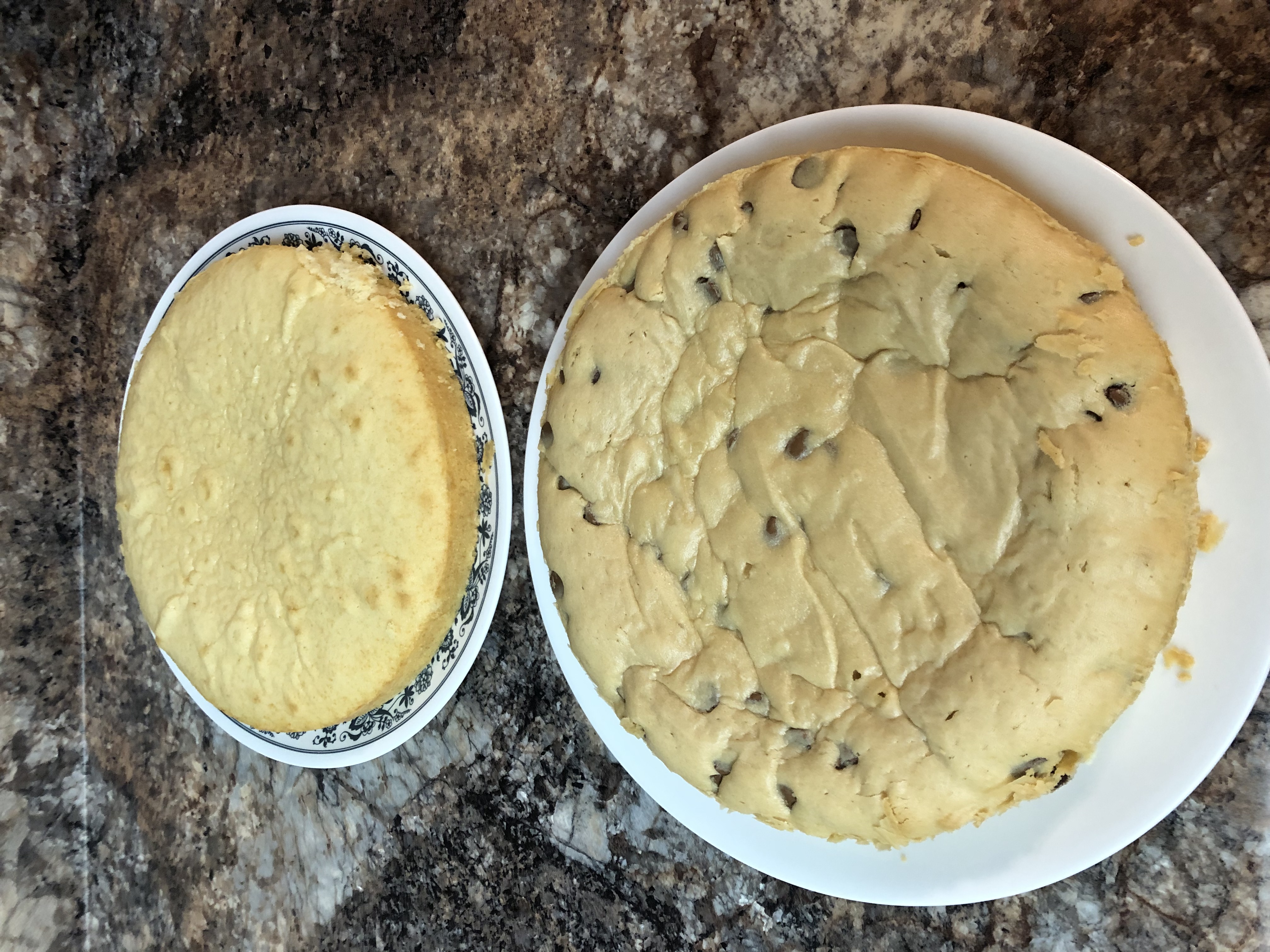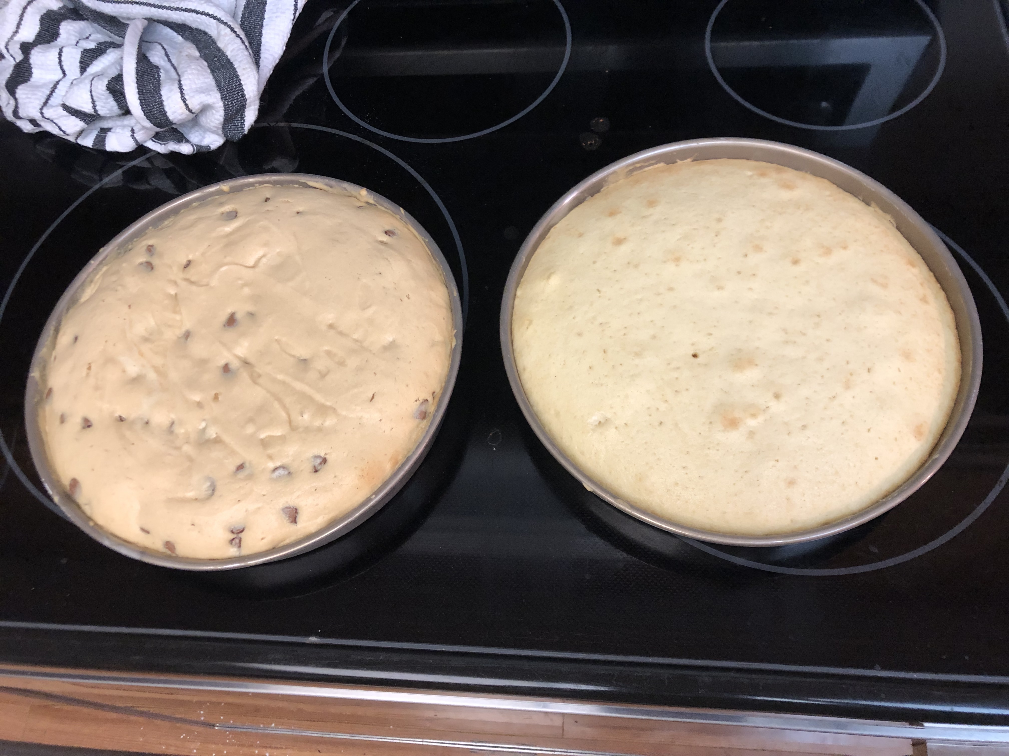 - Grease two 9-inch round cake pans. Line with parchment paper along the bottom, and grease again. Pour roughly half of the better into either pan. In the picture, the second half received peanut butter and chocolate chips, as an (quite successful) experiment.
