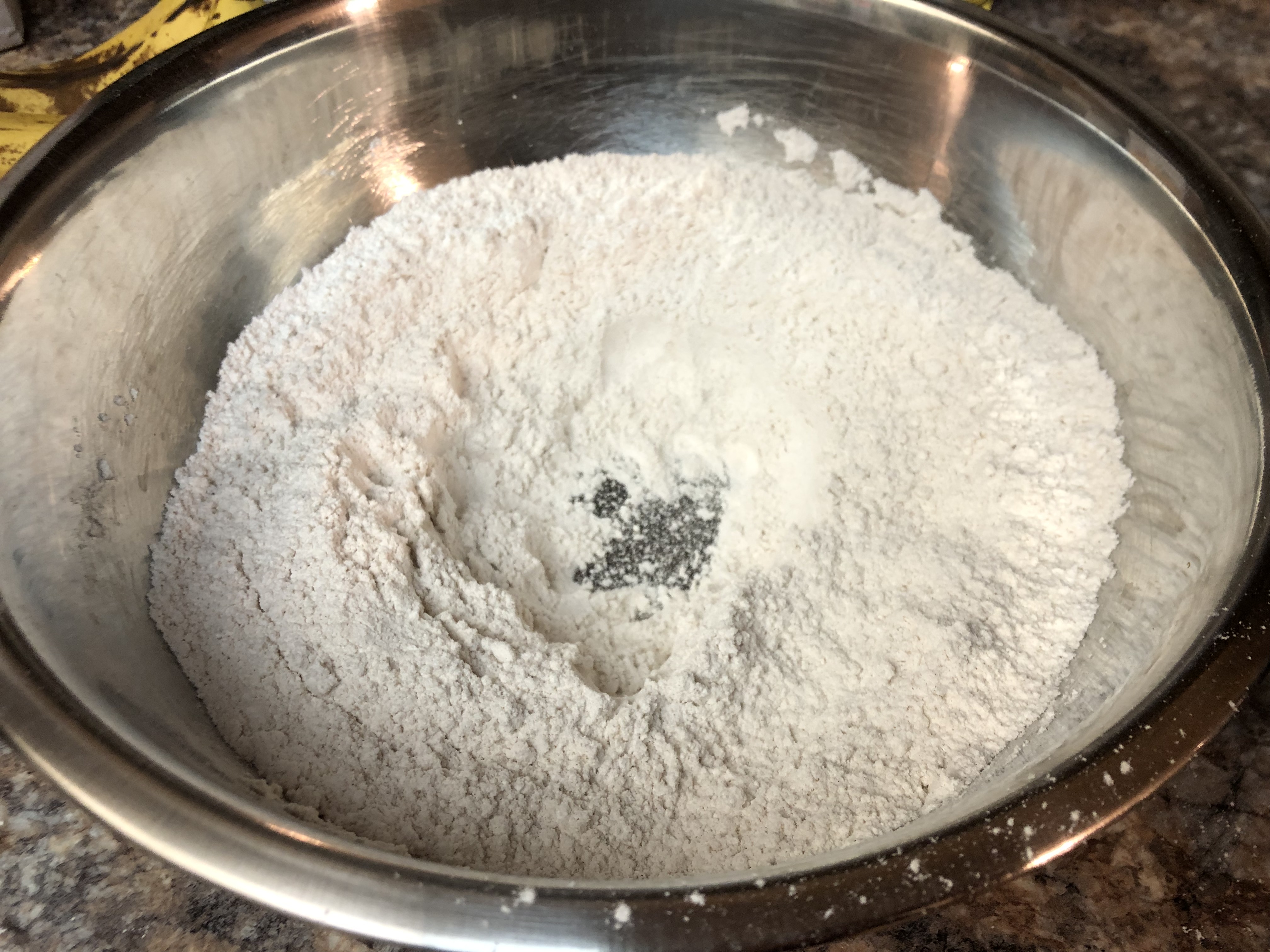- Add the banana mixture to the flour mixture. Stir until just moistened. The batter will be lumpy. Fold in chocolate chips or any other nuts/topping of choice.