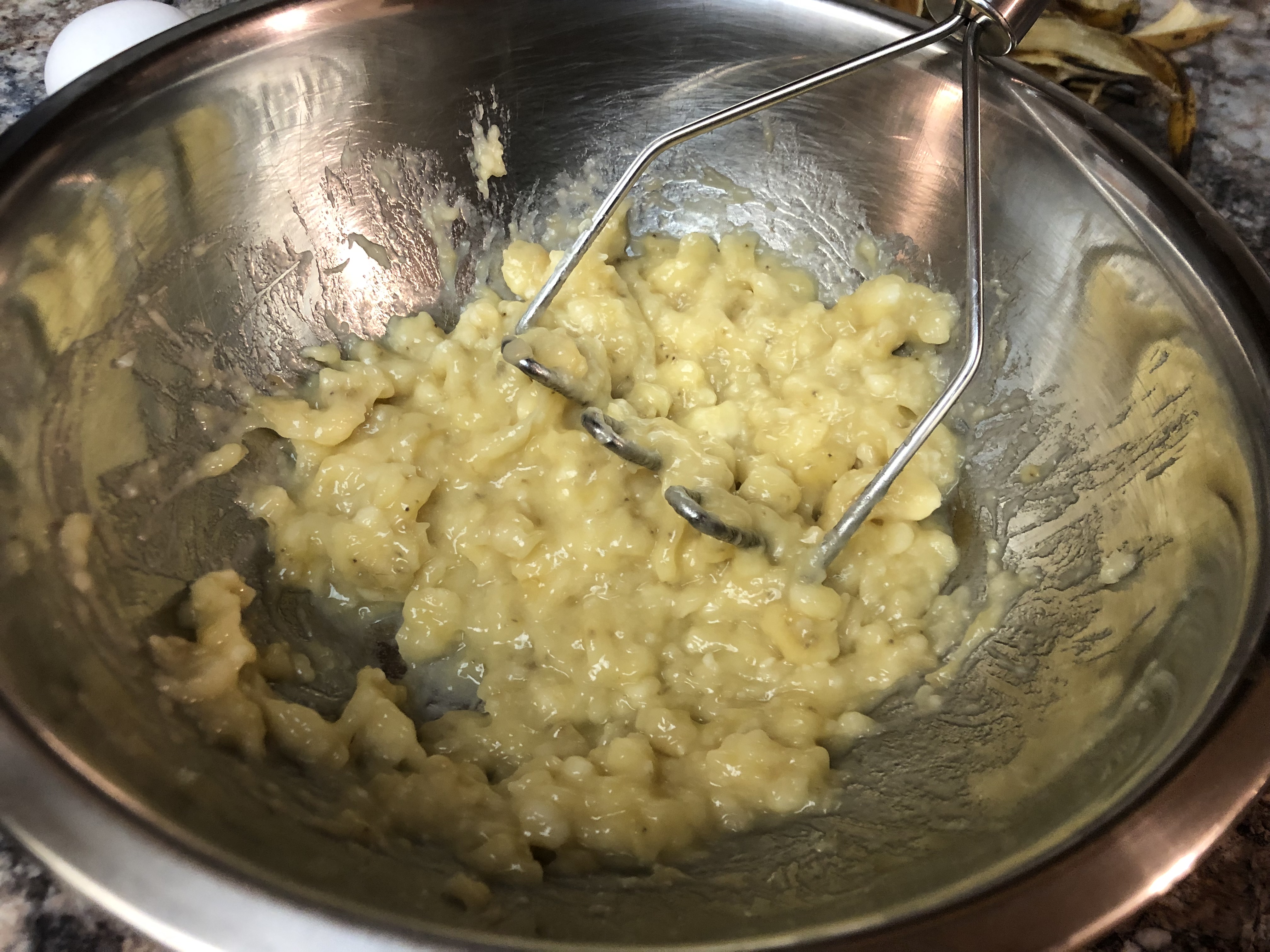 - In a different bowl, peel and mash the bananas using a fork, potato masher, or utensil of choice.