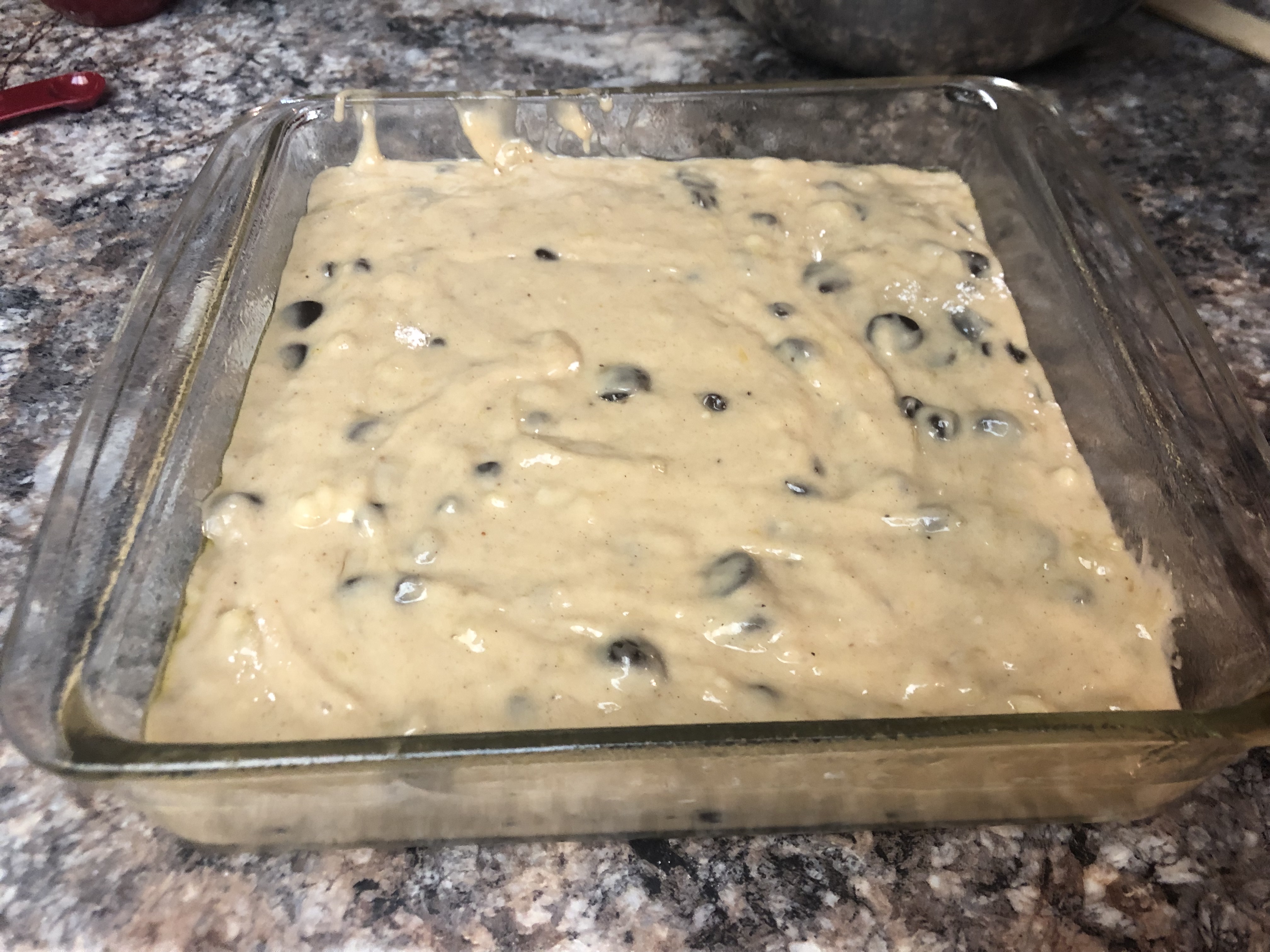 - Add batter to the greased dish and spread evenly.